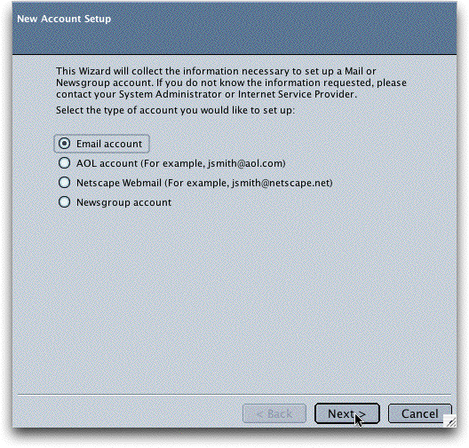 2. If no mail accounts have been set up, the New Account Setup wizard will start automatically. Make sure "Email account" is selected, and click "Next".